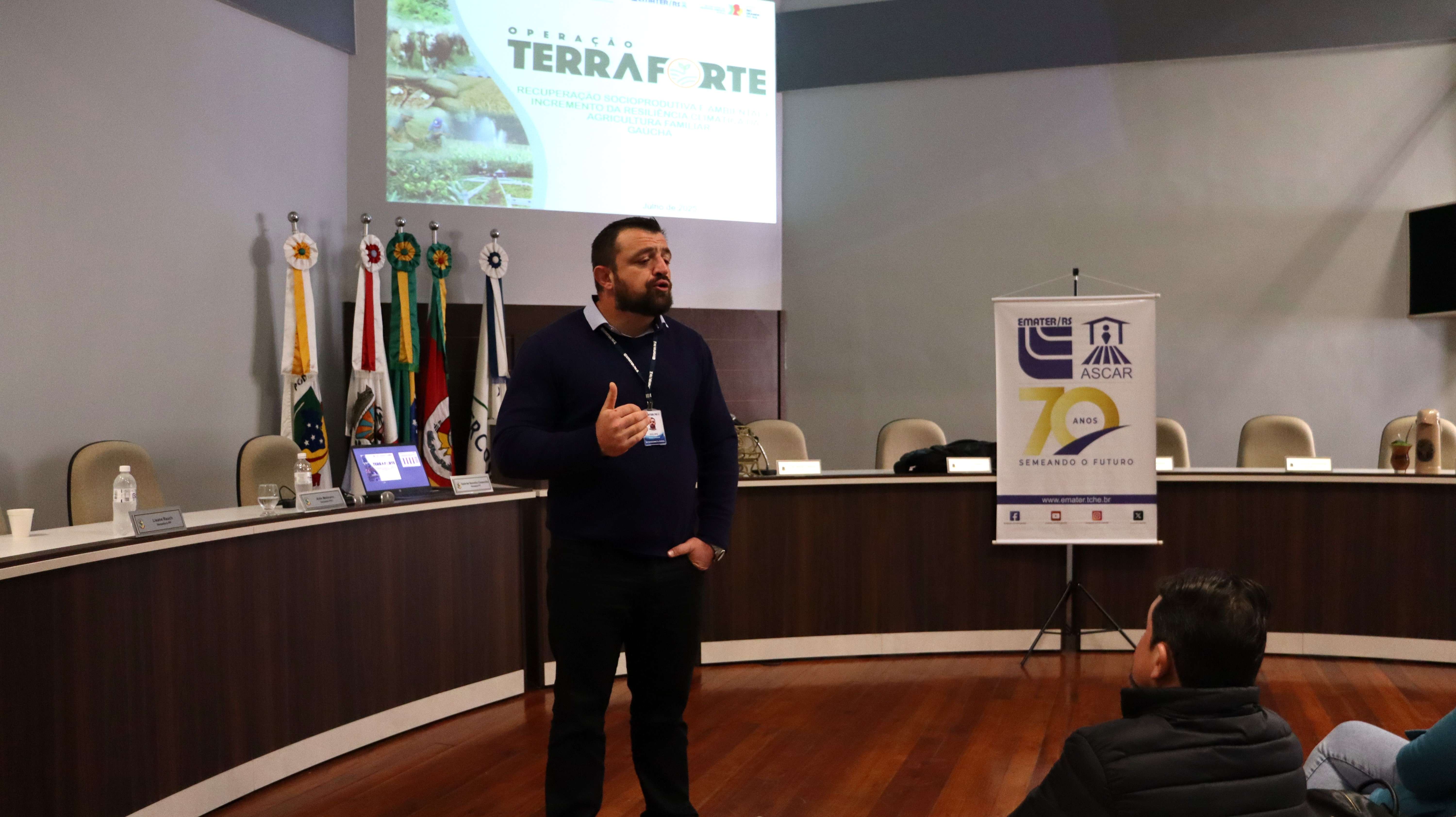 A apresentação detalhada do programa foi conduzida pelo Dr. Felipe Lorensini, da Emater Regional de Frederico Westphalen, que inicialmente abordou importantes dados climáticos que afetaram o estado do RS nos últimos anos e, em seguida, forneceu informações mais aprofundadas sobre o Programa Terra Forte e suas etapas de seleção.