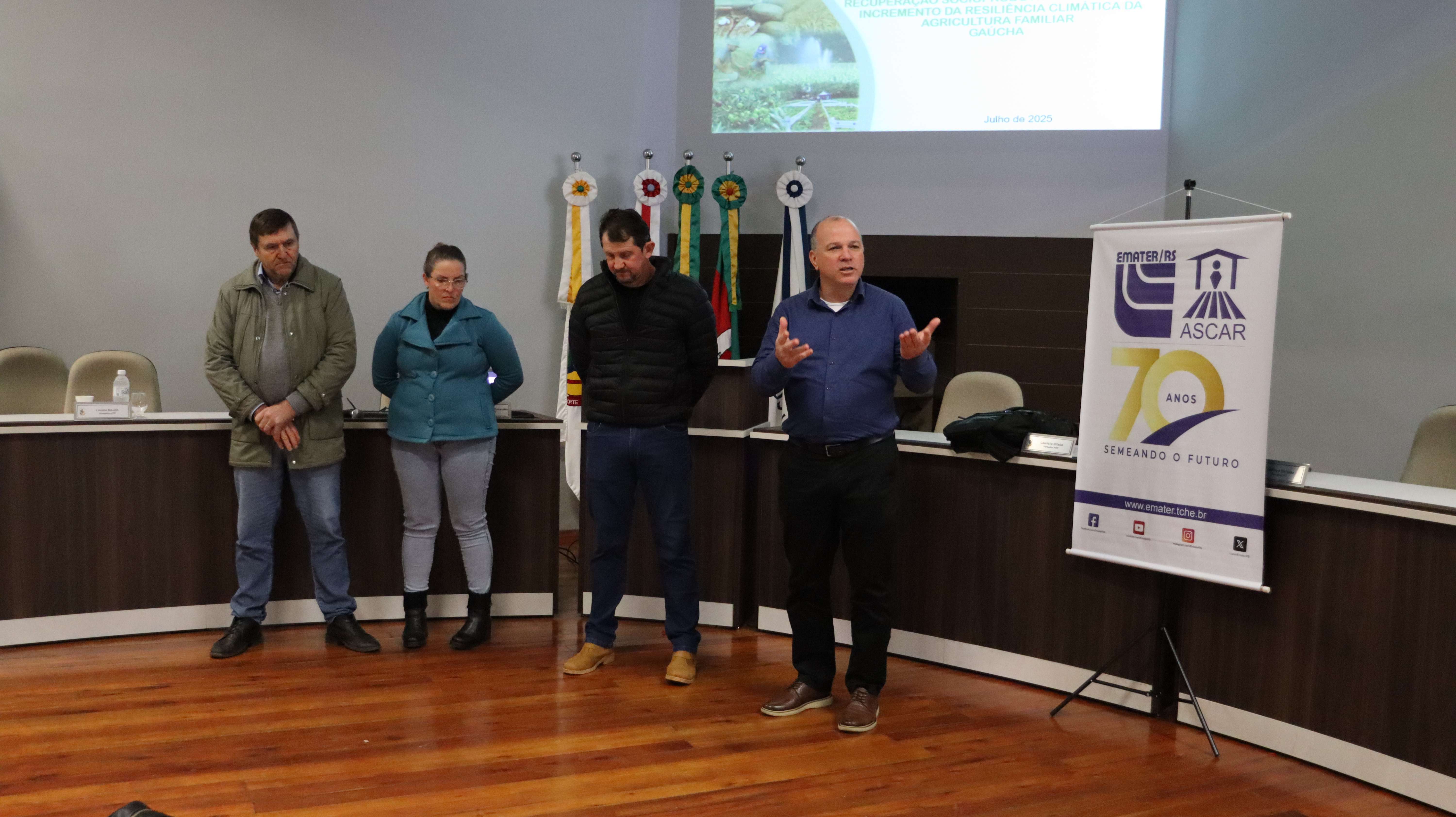 A apresentação detalhada do programa foi conduzida pelo Dr. Felipe Lorensini, da Emater Regional de Frederico Westphalen, que inicialmente abordou importantes dados climáticos que afetaram o estado do RS nos últimos anos e, em seguida, forneceu informações mais aprofundadas sobre o Programa Terra Forte e suas etapas de seleção.